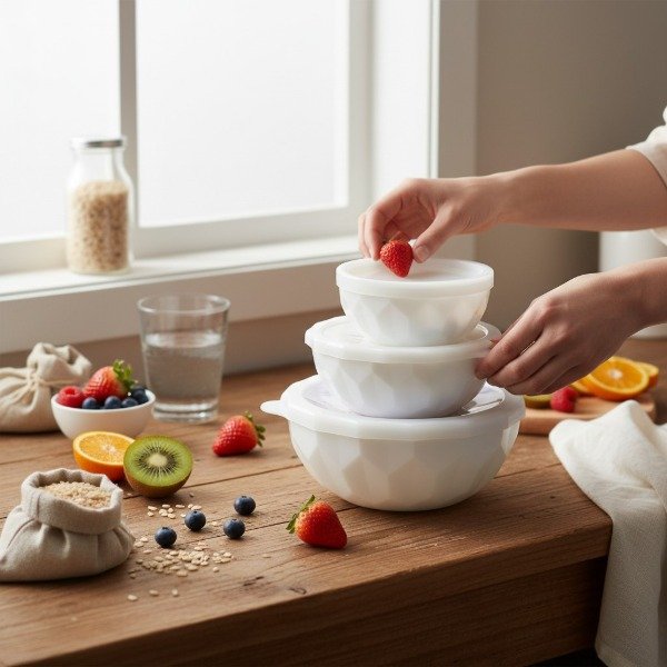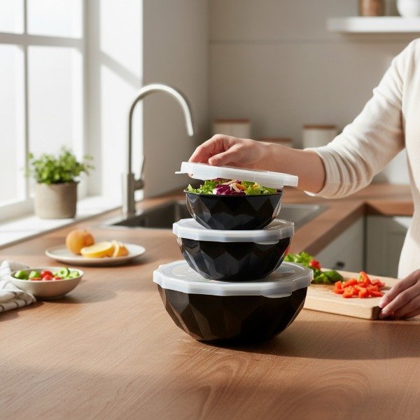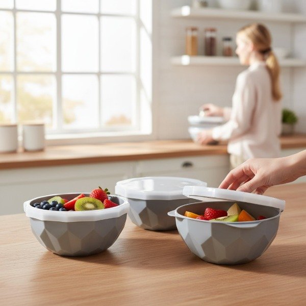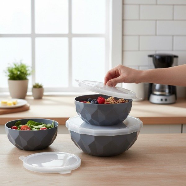 SET DE 3 BOWLS FACETEADOS HERMETICOS CON TAPA PLASTICO PREMIUM COLORES CLASICOS