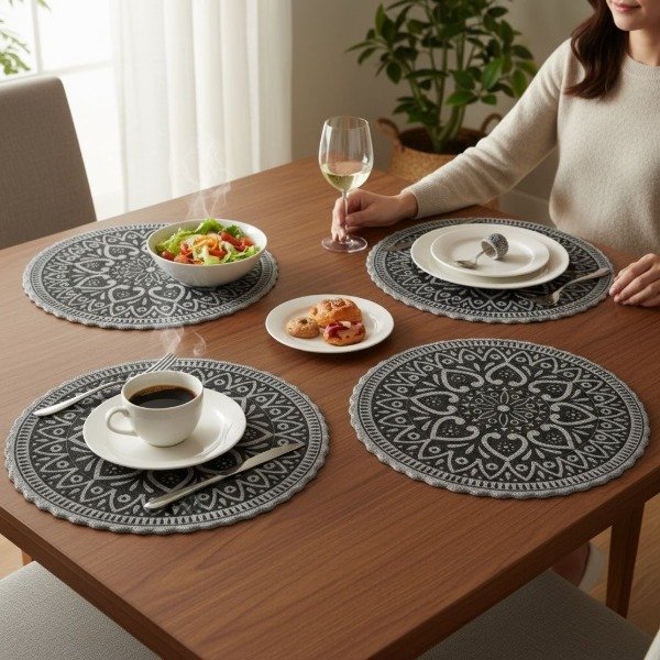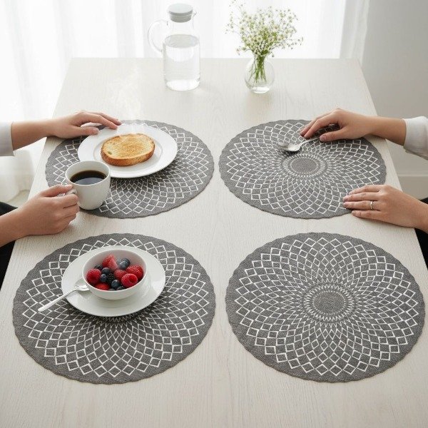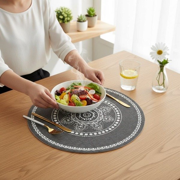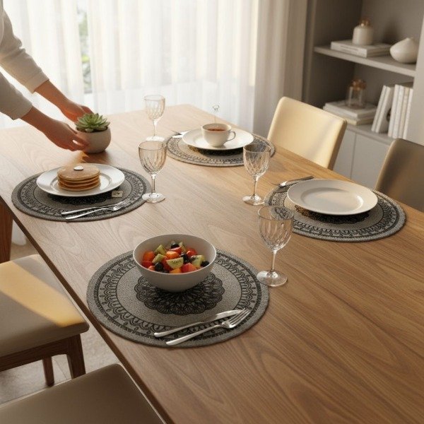 SET DE 4 INDIVIDUALES 38 CM SIMIL ARPILLERA REDONDOS PREMIUM GRISM IMPORTADOS