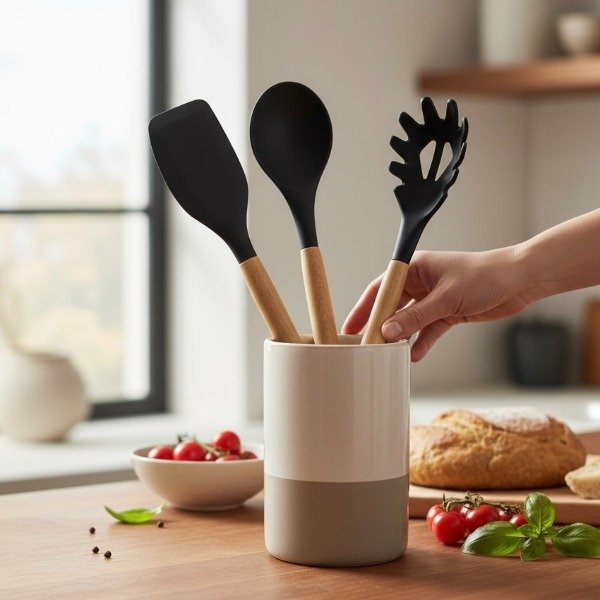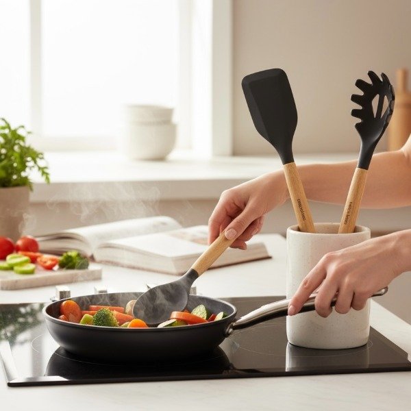 SET UTENSILIOS PREMIUM MADERA Y SILICONA: CUCHARON + ESPATULA + C PASTAS 32CM
