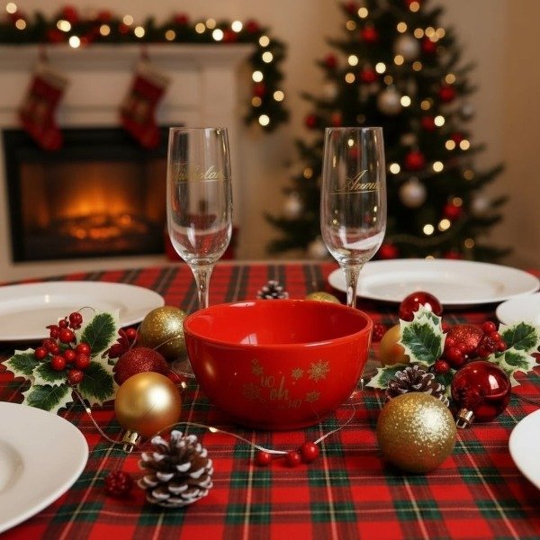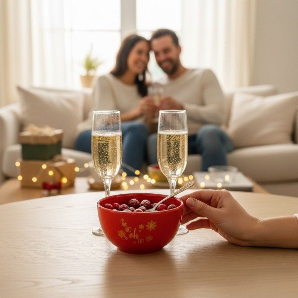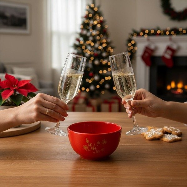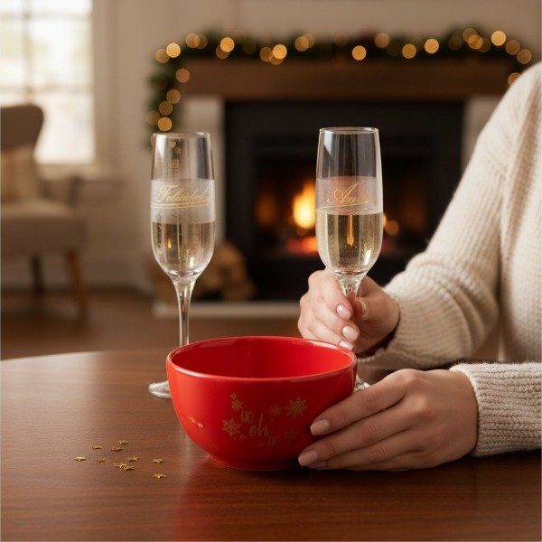 Set 2 copas de champán de vidrio vitrificadas 215ml + cuenco de cerámica con frase dorada en caja