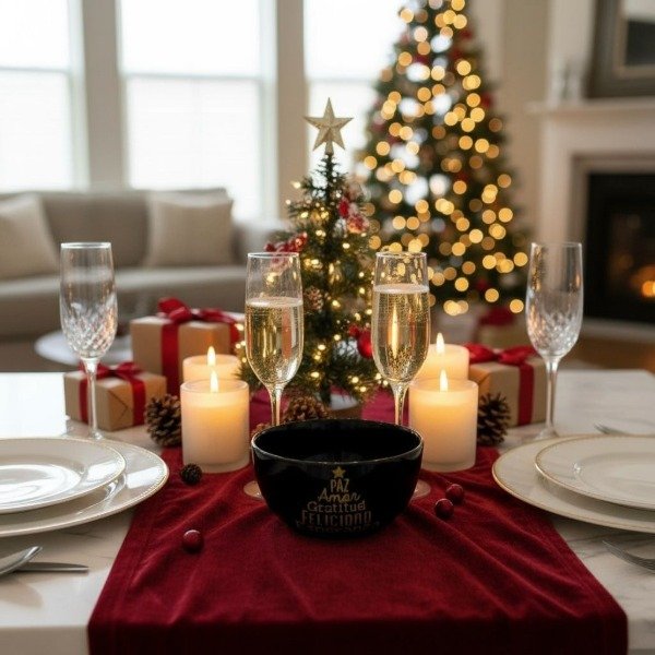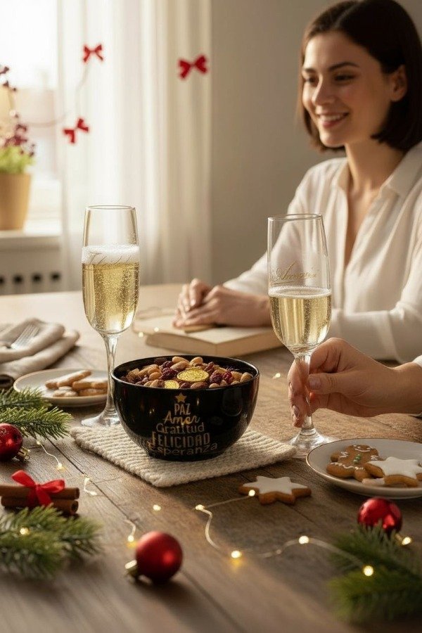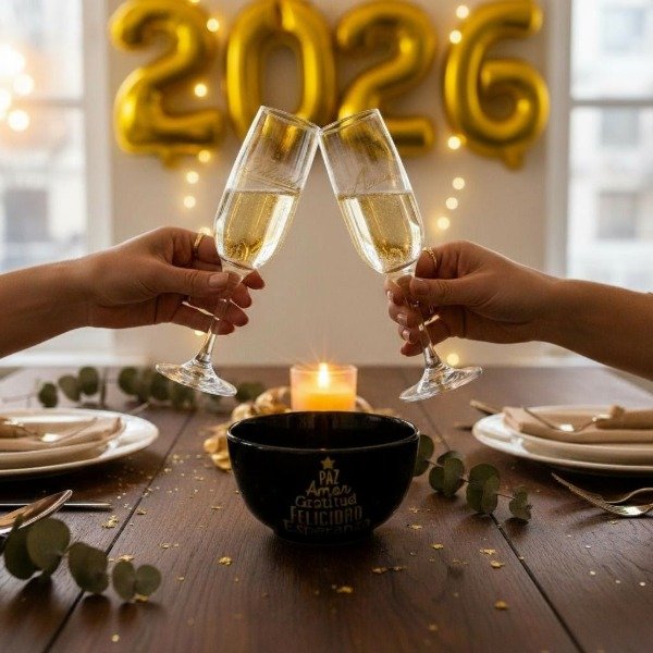 SET 2 COPAS DE CHAMPAGNE VITRIF CON FRASE DORADA + CUENCO CERAMICA NEGRO EN CAJA