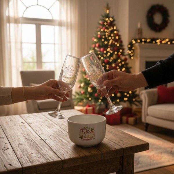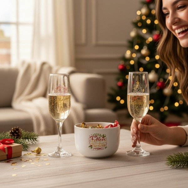 Set 2 copas de champán de vidrio vitrificadas 215ml + cuenco de cerámica con frase dorada en caja