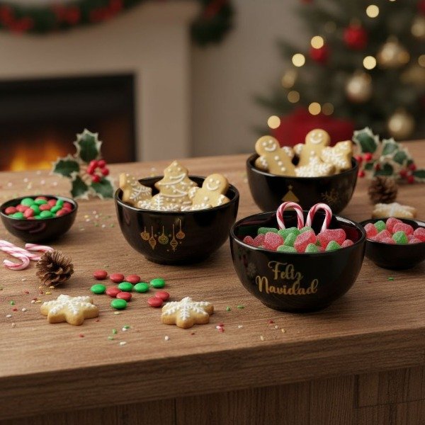SET 4 CUENCOS NEGROS NAVIDEÑOS CON DETALLE DORADO DE CERÁMICA 350CC EN CAJA